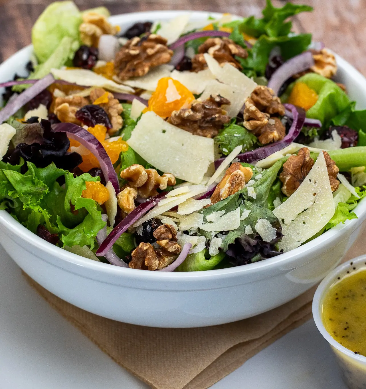 Spring mix, mandarin oranges, craisins, walnuts, red onions, shaved parmesan, and a house-made poppyseed dressing