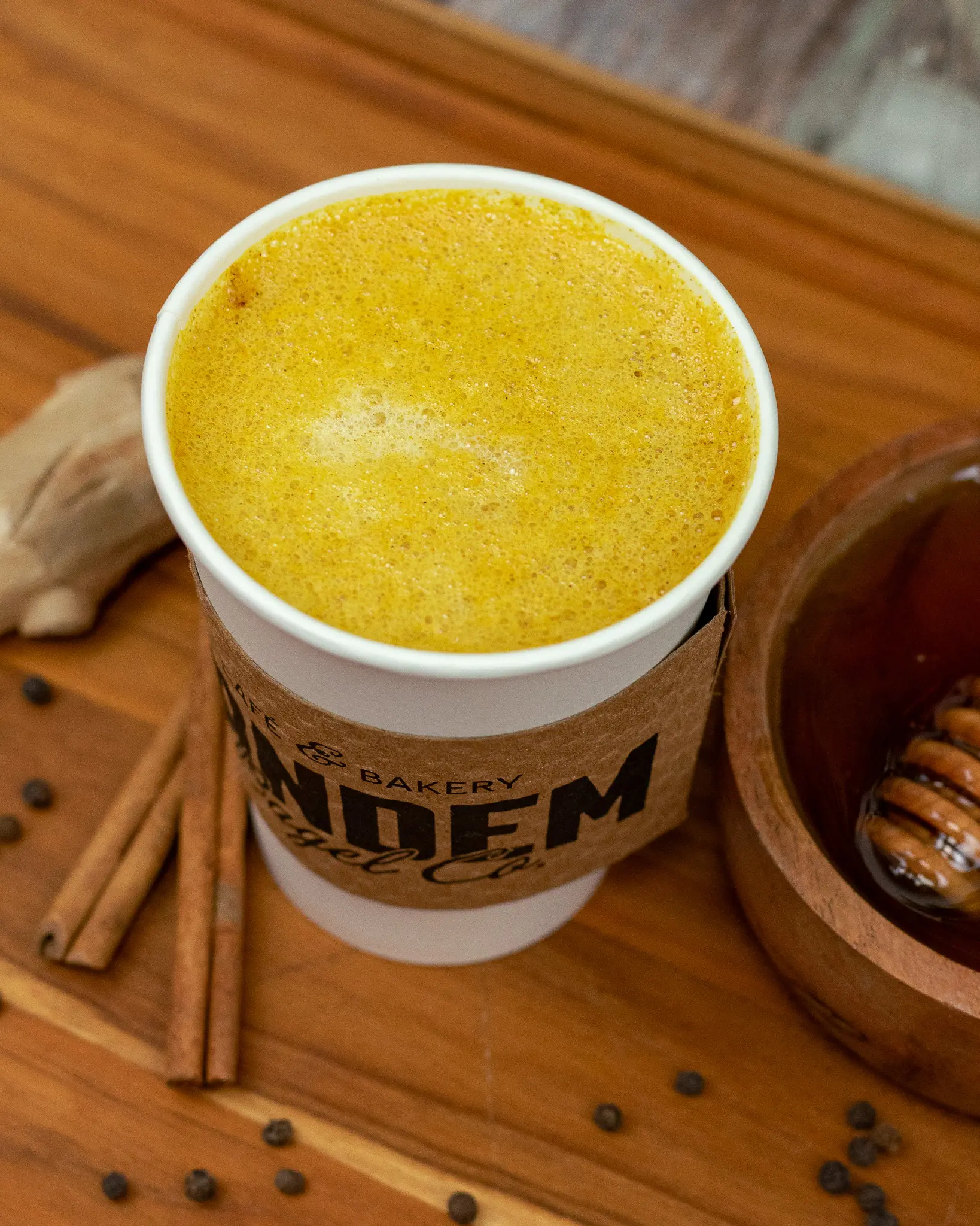 A blend of turmeric, cinnamon, ginger, and a dash of black pepper with honey syrup and steamed milk (hot only)